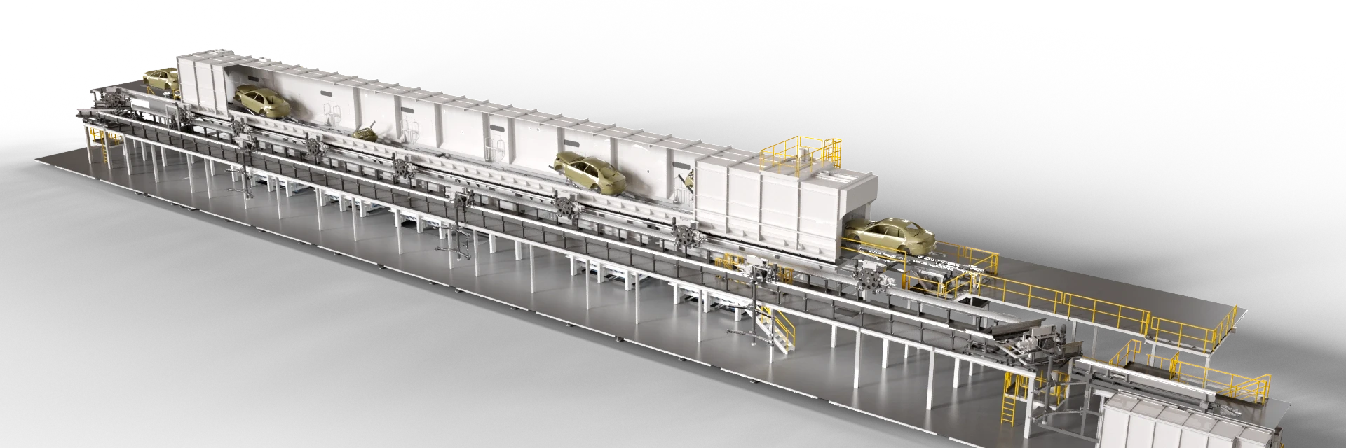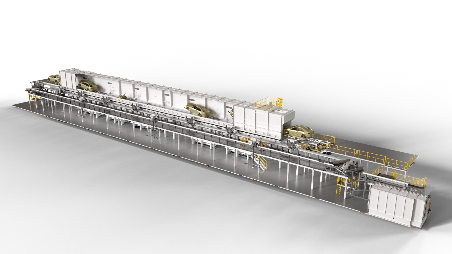 Stellantis opted for Dürr’s patented RoDip® rotational dip process for pretreatment and cathodic electrocoating. This innovative method rotates the bodies around their axis, providing exceptional corrosion protection since the dip curves can be individually adapted to different body types, optimizing the immersion, flooding, and draining process. RoDip® consumes much less water, fewer chemicals, and less heating energy than other technical solutions since the conveyor system eliminates the need for inclined tank entrances and exits. This shortens the immersion tank length by up to six meters and reduces tank volume. Lower energy and material consumption also reduces operating and unit costs.