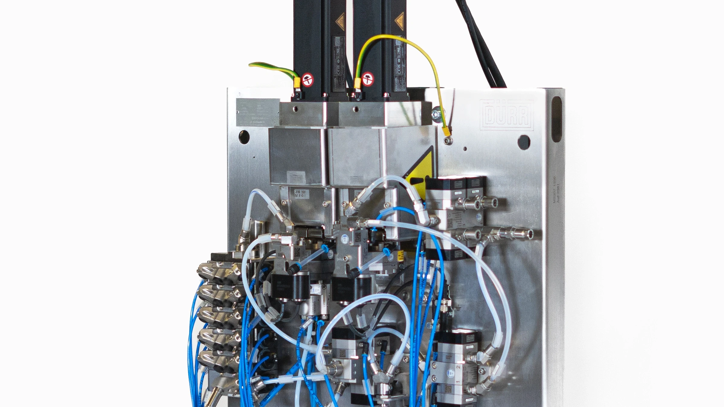 The Fluid Board is designed to be fully controlled by the EcoAUC control unit, encompassing the most common 1C and 2C processes across low and high-pressure ranges and supplies the EcoBell2 atomizer or the EcoGun spray gun with paint and rinsing agents. This makes the product ideal for tasks in industrial painting technology, such as in the wood, construction, or automotive supplier industries. The Fluid Board significantly reduces engineering and assembly effort. “The Fluid Board comes fully assembled, so all you need to do is connect hoses and cables,” explains Stephan Voigt, product engineer at Dürr.