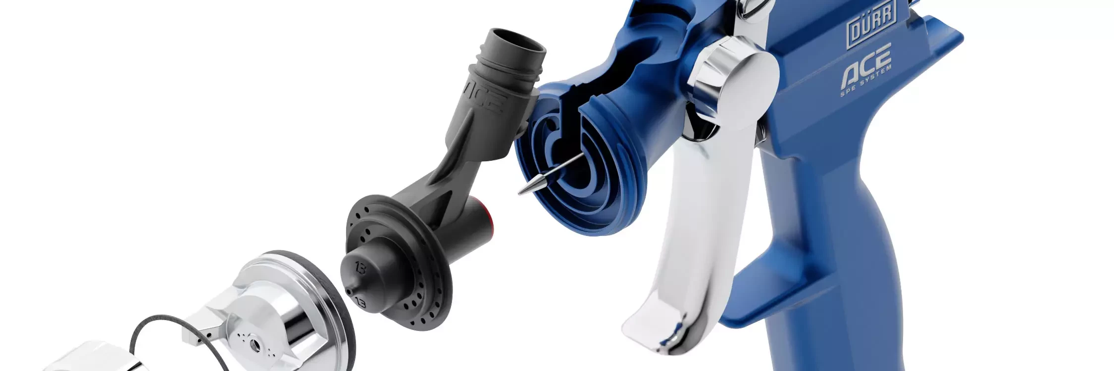 Like all Dürr low-pressure spray guns, the latest model, the EcoGun ACE, has a robust design well suited for industrial use. It provides a demonstrably exceptional spray pattern with excellent application efficiency and simplifies color changing with quick exchange injector nozzles. A particularly robust and spill-proof cup system from HSM Lackiersysteme enhances the new product. The cup system incorporates both a safety lock and a soiling guard, to ensure good legibility of the measuring scales at all times. The highlight of the new spray gun is an innovative, rapid-change system for the color channel, resulting in significant time and cost savings. The product is well-suited for applications in various areas such as woodworking, vehicle paintwork repairs, and yacht and boat building applications.